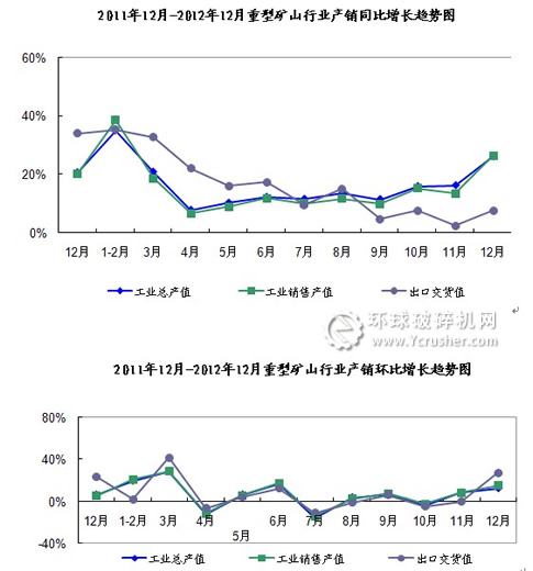 2012年1-12月份,全國(guó)重型礦山機(jī)械行業(yè)的發(fā)展形勢(shì)有所回升,工業(yè)總產(chǎn)值和銷售產(chǎn)值同比增速明顯上升,環(huán)比增速平緩,出口交貨值同、環(huán)比增速均有所回升。