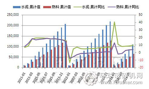 2013年1-6月,全國累計水泥產(chǎn)量10.96億噸,同比增長9.67%;熟料產(chǎn)量6.47億噸,同比增長4.15%。相比之下,去年上半年全國累計水泥產(chǎn)量9.94億噸,同比增速為5.5%。從上半年的情況看,今年水泥和熟料增長水平全面超過去年同期。