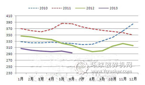 圖2:2010-2013年上半年P(guān).O42.5散裝水泥價格走勢(元/噸)