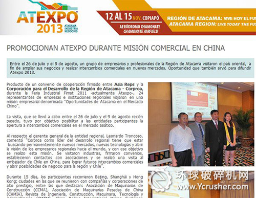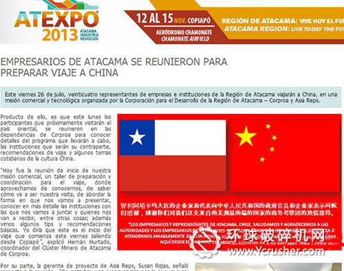 智利采礦業(yè)非常重視這次合作交流,將這次合作交流的內(nèi)容登在了智利阿塔卡瑪大區(qū)的官方網(wǎng)站上。并且,智利阿塔卡瑪大區(qū)的企業(yè)家和代表向中華人民共和國的政府官員和企業(yè)家表示了問候和感謝,感謝對他們這支來自南美洲最南端的國家的商務(wù)考察團的熱情接待。