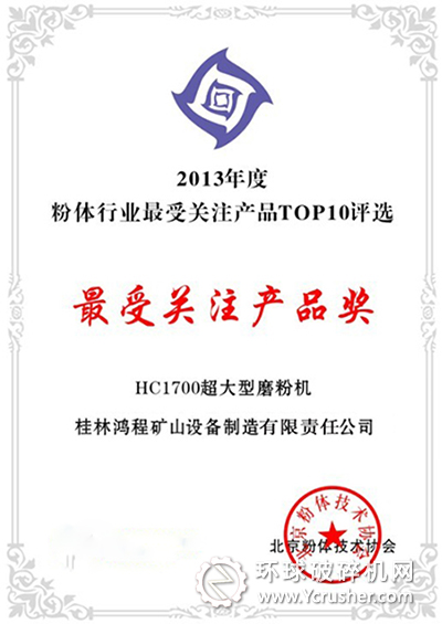如今2013年已成為過去,2014年剛剛開啟之際,桂林鴻程礦山設(shè)備制造有限責(zé)任公司HC1700大型縱擺式磨粉機(jī)被北京粉體技術(shù)協(xié)會(huì)評(píng)選為粉體行業(yè)最受關(guān)注產(chǎn)品,評(píng)選以真實(shí)數(shù)據(jù)為依據(jù),HC1700大型縱擺式磨粉機(jī)擁有多項(xiàng)國(guó)家專利技術(shù),其高產(chǎn)、高效、節(jié)能、環(huán)保等,受到了粉體行業(yè)人士的高度關(guān)注。