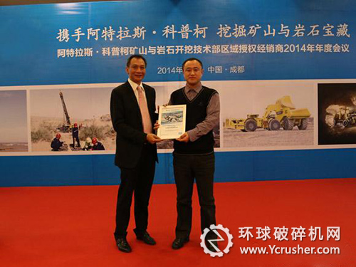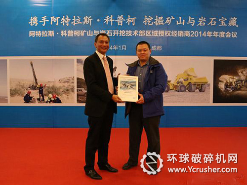 阿特拉斯·科普柯礦山與巖石開(kāi)挖技術(shù)部大中華區(qū)客戶中心總經(jīng)理文揚(yáng)之(左)向2013年度銷(xiāo)售增長(zhǎng)獎(jiǎng)獲得者(右)頒獎(jiǎng)