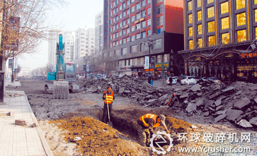 工地上破碎機(jī)、挖掘機(jī)開始破碎路面。