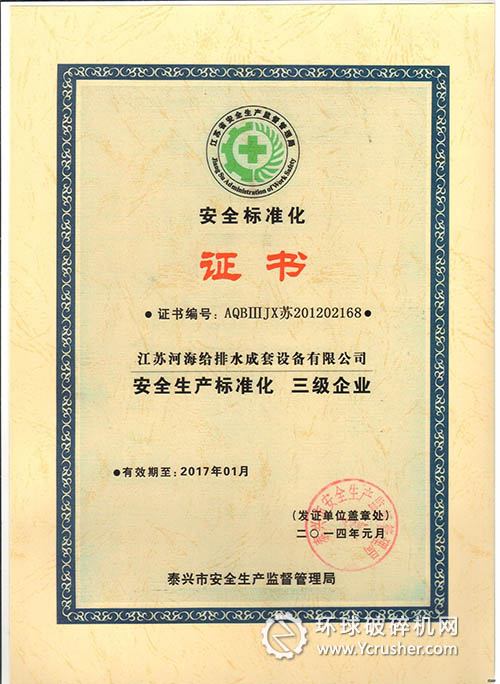 江蘇河海給排水成套設(shè)備有限公司榮獲“安全生產(chǎn)標(biāo)準(zhǔn)化三級(jí)企業(yè)”證書。