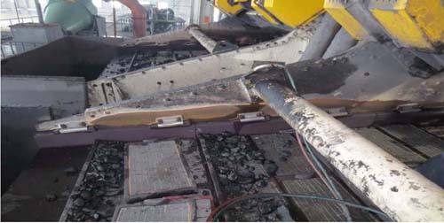 篩機帶料運行時,篩面物料偏載嚴重,導(dǎo)致出料端右側(cè)(順煤流方向)物料過多明顯多于左側(cè);并且篩上物料過厚,物料幾乎和起吊梁接觸。