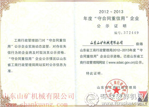 近日,山東山礦機(jī)械有限公司收到由山東省工商行政管理局頒發(fā)《山東省工商局關(guān)于公示2012-2013年度“守合同重信用”企業(yè)公示證明》,這是公司自開始申報(bào),連續(xù)十幾年獲得此榮譽(yù)稱號(hào)。