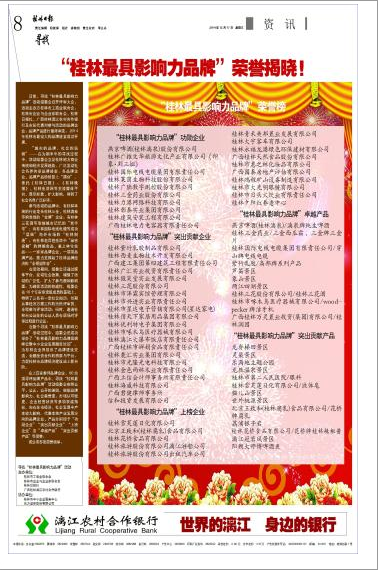 尋找“桂林最具影響力品牌”是由桂林市工商聯(lián)、桂林市企業(yè)與企業(yè)家聯(lián)合會、桂林日報社、桂林漓江農(nóng)村合作銀行,為拓展桂林經(jīng)濟(jì)發(fā)展空間,進(jìn)一步營造品牌建設(shè)氛圍,提升桂林經(jīng)濟(jì)整體檔次而聯(lián)合主辦的。