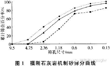 隨著中國基礎(chǔ)設(shè)施建設(shè)的迅猛發(fā)展和對(duì)環(huán)境保護(hù)的日益重視,現(xiàn)有的天然砂已經(jīng)不能滿足工程建設(shè)的需要,使用機(jī)制砂配制混凝土已成為今后的發(fā)展趨勢(shì)。但機(jī)制砂與河砂相比,其顆粒表面粗糙、多棱角,且機(jī)制砂大多數(shù)級(jí)配不良,0.630~0.315 mm級(jí)顆粒偏少,并含有大量粒徑小于0.075 mm的石粉。這些石粉與母巖的化學(xué)成分完全一樣,且大量的研究表明,適量的石粉對(duì)機(jī)制砂混凝土的工作性和強(qiáng)度無不利的影響,甚至還可以改善混凝土的性能。