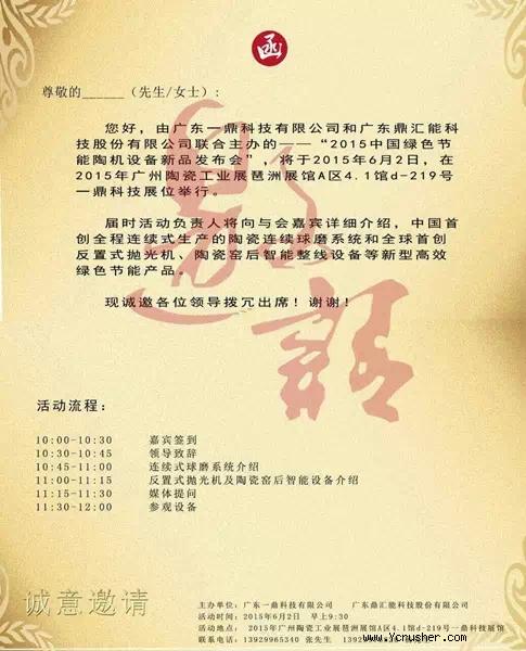 您好,由廣東鼎匯能科技股份有限公司和廣東一鼎科技有限公司聯(lián)合主辦的——“2015中國(guó)綠色節(jié)能陶機(jī)設(shè)備新品發(fā)布會(huì)”,將于2015年6月2日,在2015年廣州陶瓷工業(yè)展琶洲展館A區(qū)4.1館d-219號(hào)一鼎科技展位舉行。屆時(shí)活動(dòng)負(fù)責(zé)人將向與會(huì)嘉賓詳細(xì)介紹,中國(guó)首創(chuàng)全程連續(xù)式生產(chǎn)的陶瓷連續(xù)球磨系統(tǒng)和全球首創(chuàng)反置式拋光機(jī)、陶瓷窯后智能整線設(shè)備等新型高效綠色節(jié)能產(chǎn)品。現(xiàn)誠(chéng)邀各位領(lǐng)導(dǎo)撥冗出席!謝謝!