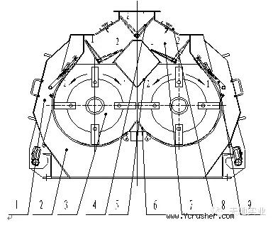 根據(jù)轉(zhuǎn)子的旋轉(zhuǎn)方向,使物料由左邊或右邊進入粉碎室。進料導(dǎo)向板的換向由手動并通過行程開關(guān)改變電機的轉(zhuǎn)向,使與進料方向相符。如圖一所示當(dāng)雙轉(zhuǎn)子都順時針旋轉(zhuǎn)時,三個導(dǎo)料板位于“1”位置;當(dāng)雙轉(zhuǎn)子逆時針旋轉(zhuǎn)時,三個導(dǎo)料板位于“2“位置。
