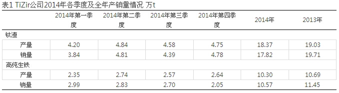 據(jù)悉,TiZir公司2014年的鈦渣產(chǎn)量為18.37萬t,較2013年同期的19.03萬t下降3%,這主要由于該公司在2014年3月檢修回轉(zhuǎn)窯所致。2014年鈦渣銷量較2013年同期的19.71萬t也隨之下降11%,預(yù)計在2015年第三季度會有所好轉(zhuǎn)。TiZir公司2014年各季度及全年產(chǎn)銷量情況見表1。