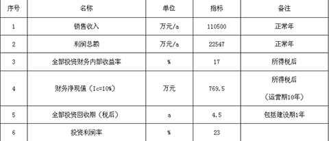 1.4財務(wù)分析及社會評價1.4.1主要財務(wù)指標項目達產(chǎn)后,年銷售收入110500萬元,利潤22547萬元,投資回收期4.5年(稅后,含建設(shè)期1年),投資利潤率23%。
