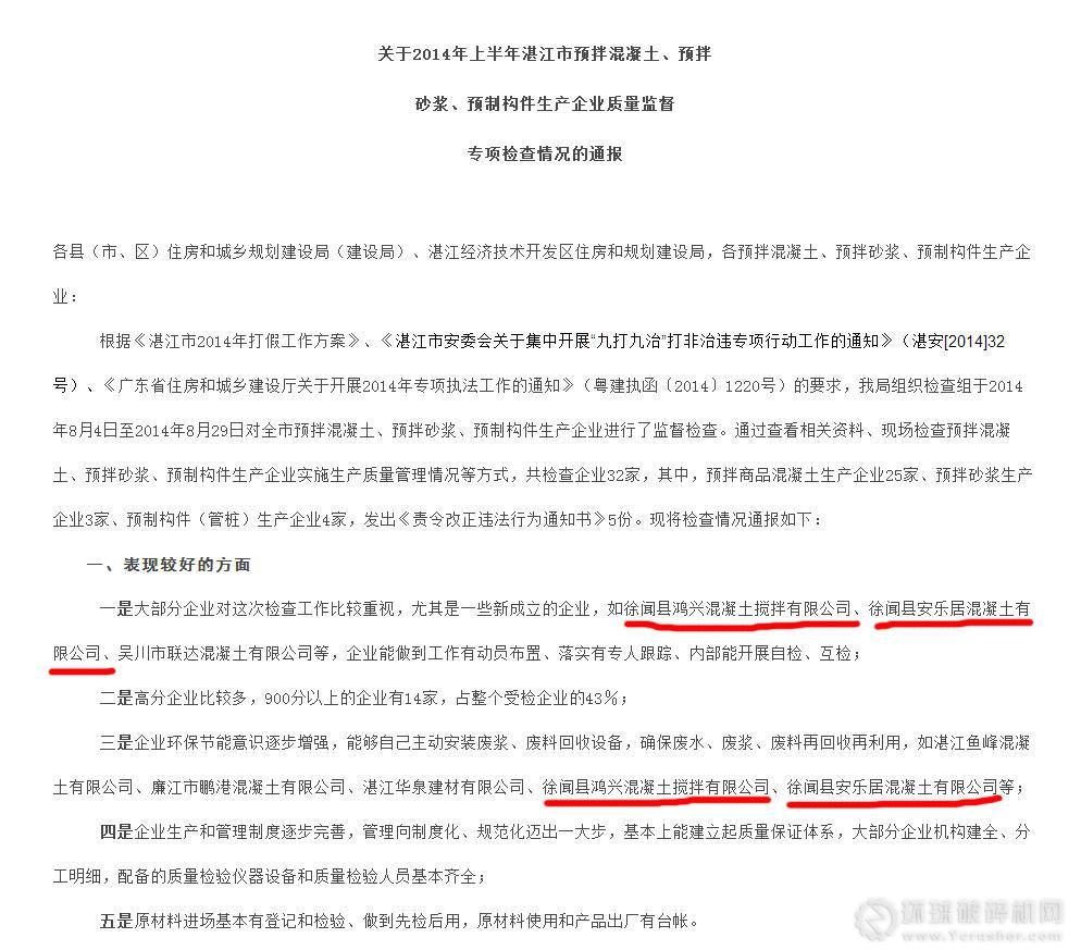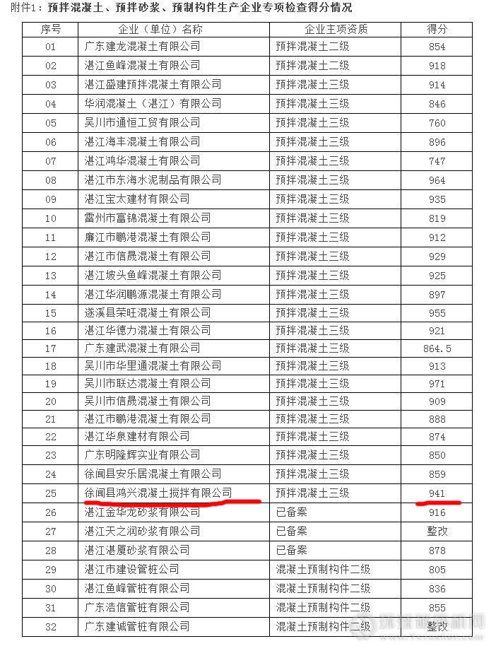 2014年湛江市住建局對全市范圍內(nèi)預拌混凝土企業(yè)進行質(zhì)量監(jiān)督專項檢查,鴻興公司以高分位居前五名。資料鏈接: