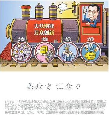 月9日,李克強(qiáng)總理在大連考察時(shí)提出,“只要集眾智匯眾力,我們就一定能成大事,就一定能為經(jīng)濟(jì)發(fā)展注入澎湃動(dòng)力。”僅僅7天后,建設(shè)大眾創(chuàng)業(yè)、萬(wàn)眾創(chuàng)新支撐平臺(tái)便成為了國(guó)務(wù)院常務(wù)會(huì)議的議題。會(huì)議決定,要利用“互聯(lián)網(wǎng)+”,積極發(fā)展眾創(chuàng)、眾包、眾扶、眾籌等新模式,形成創(chuàng)新驅(qū)動(dòng)發(fā)展新格局。 據(jù)中國(guó)日?qǐng)?bào)