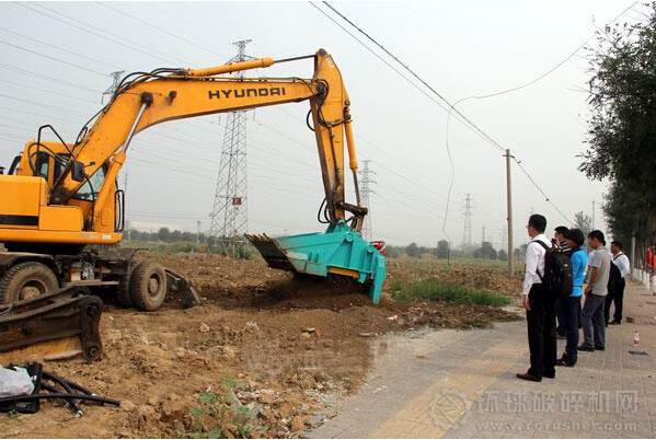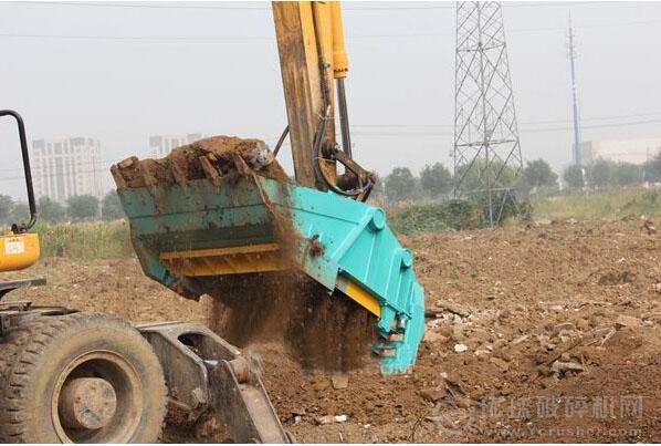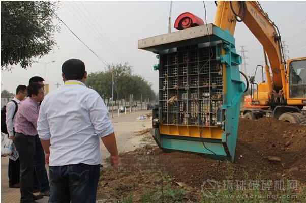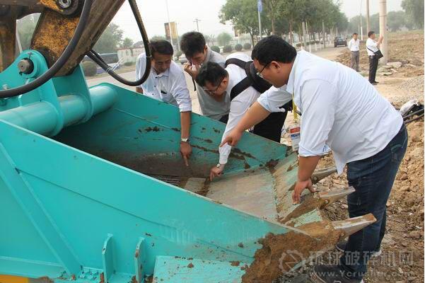在場地的另一面,山東銘德CS-200水平篩分斗安裝在現代輪式挖掘機上進行現場演示。
