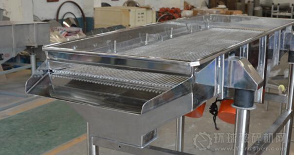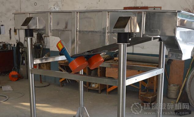 直線振動(dòng)篩是由篩箱、篩框、振動(dòng)電機(jī)、減振系統(tǒng)及座架等組成。它是利用兩臺(tái)振動(dòng)電機(jī)作為振動(dòng)源,固定在篩箱上兩臺(tái)相同的振動(dòng)電機(jī)做相反方向自同步旋轉(zhuǎn),振動(dòng)電機(jī)所帶的偏心塊在旋轉(zhuǎn)時(shí)各個(gè)瞬間位置所產(chǎn)生的離心力之分力沿拋擲方向作往復(fù)運(yùn)動(dòng),使支承在減振器上的整個(gè)篩機(jī)做直線振動(dòng),使物料在篩面上被拋起的同時(shí)向前作直線運(yùn)動(dòng),物料從入料端落入篩框后,迅速前進(jìn)、松散透篩,完成篩分作業(yè),以合理匹配篩網(wǎng)達(dá)到篩分的目的。