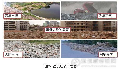 就全國而言,《我國建筑垃圾資源化產(chǎn)業(yè)發(fā)展報(bào)告》(2014年度)顯示,建筑垃圾年產(chǎn)量達(dá)到了15億噸,并將持續(xù)增加,至2020年達(dá)到峰值。如此數(shù)量驚人的建筑垃圾充斥在我們的周圍,產(chǎn)生了巨大的危害,如圖2所示。
