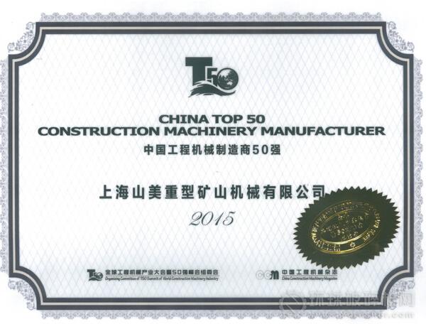 機(jī)械工業(yè)協(xié)會(huì)、美國設(shè)備制造商協(xié)會(huì)、日本建設(shè)機(jī)械協(xié)會(huì)、韓國建設(shè)機(jī)械協(xié)會(huì)共同主辦的“2015全球工程機(jī)械產(chǎn)業(yè)大會(huì)暨50強(qiáng)峰會(huì)”上,山美又榮獲2015中國工程機(jī)械50強(qiáng)企業(yè)殊榮。