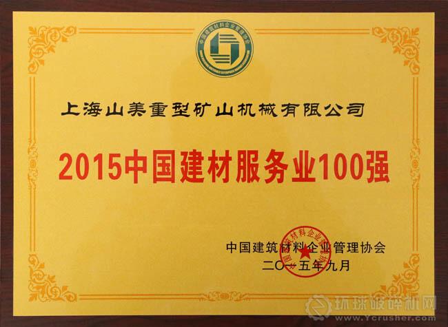 2015年9月中旬,在由中國建筑材料企業(yè)管理協(xié)會(huì)組織召開的“2015中國建材企業(yè)發(fā)展論壇暨2015中國建材企業(yè)500強(qiáng)、建材服務(wù)業(yè)100強(qiáng)、民營建材企業(yè)100強(qiáng)、最具成長(zhǎng)性建材企業(yè)100強(qiáng)發(fā)布會(huì)”上,上海山美獲2015中國建材服務(wù)業(yè)100強(qiáng),裝備供應(yīng)商全國十強(qiáng)殊榮。