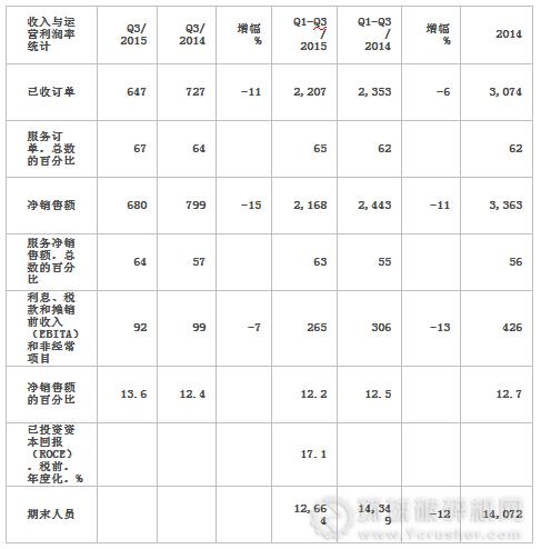 除另有說明,括號中的數(shù)據(jù)為2014年同期值。美卓已于2015年4月1日拆分過程自動(dòng)化系統(tǒng)(PAS)業(yè)務(wù),其未被計(jì)入7-9月的流體控制業(yè)務(wù)。2015年1-9月及其所有對比時(shí)間若早于拆分日的,則該數(shù)據(jù)包括PAS業(yè)務(wù)。其他相同經(jīng)營業(yè)務(wù)下的對比數(shù)據(jù)已單獨(dú)說明。
