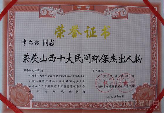 項(xiàng)目,被命名為國(guó)家重點(diǎn)環(huán)保示范工程,被環(huán)保部授予環(huán)境保護(hù)科學(xué)技術(shù)獎(jiǎng)三等獎(jiǎng);被評(píng)為山西省環(huán)保推薦產(chǎn)品、省環(huán)保科技示范工程,被評(píng)為省高新技術(shù)優(yōu)秀項(xiàng)目,公司被命名為省環(huán)保示范單位。李九林本人獲得中國(guó)環(huán)境保護(hù)特別貢獻(xiàn)獎(jiǎng),受到黨和國(guó)家領(lǐng)導(dǎo)人的親切接見(jiàn)。