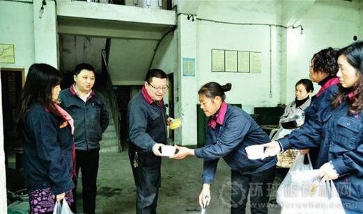 當(dāng)日下午14點,該廠15名職工家屬協(xié)管員、廠工會女工委員,兵分三路,抬上剛熬制好的玉米粥,分赴到了洗煤、機(jī)修、發(fā)電、運(yùn)輸、電檢等基層單位生產(chǎn)現(xiàn)場,為一線的職工端上熱氣騰騰的玉米粥,送上面包。400多碗玉米粥,360個面包,一句句語重心長、苦口婆心的叮囑,讓崗位職工感到了濃濃的真情。圖為家屬協(xié)管員們送溫暖的鏡頭。何建民 王玉亭