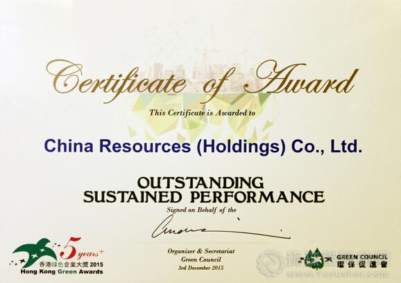 12月3日,由香港環(huán)保促進會主辦的2015年香港綠色企業(yè)大獎頒獎典禮在香港舉行。華潤獲頒“優(yōu)越環(huán)保管理獎”金獎、“超卓環(huán)保安全健康獎”金獎和“企業(yè)綠色管治獎”之環(huán)境監(jiān)測與報告獎,并被評為“杰出連續(xù)獲獎機構(gòu)(5年或以上)”。