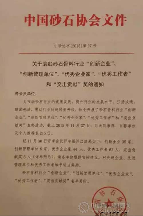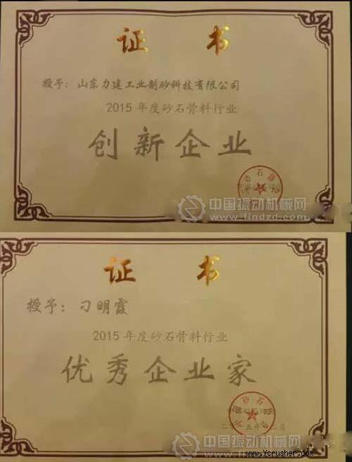熱烈祝賀山東力建工業(yè)制砂科技有限公司榮獲“2015砂石骨料行業(yè)創(chuàng)新企業(yè)”!公司董事長(zhǎng)刁明霞榮獲“優(yōu)秀企業(yè)家”稱號(hào)!!!