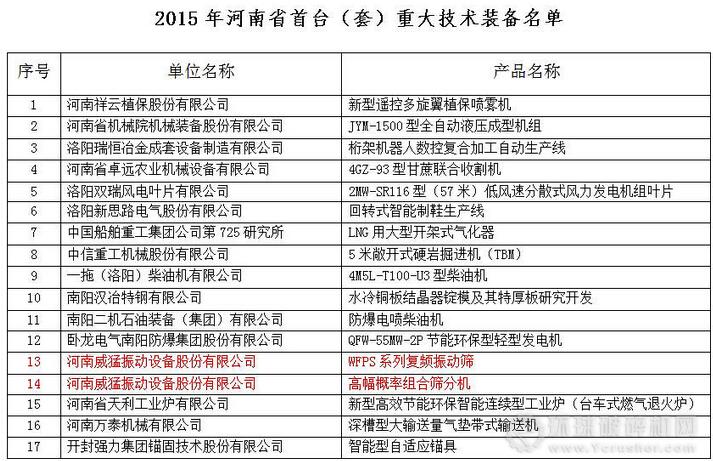 近日,2015年河南省首臺(tái)(套)重大技術(shù)裝備認(rèn)定產(chǎn)品名單出爐,全省共有29家企業(yè)的產(chǎn)品被認(rèn)定。其中,河南威猛振動(dòng)兩項(xiàng)科技產(chǎn)品“WFPS系列復(fù)頻振動(dòng)篩”和“高幅概率組合篩分機(jī)”通過河南省“首臺(tái)(套)重大技術(shù)裝備”認(rèn)定。