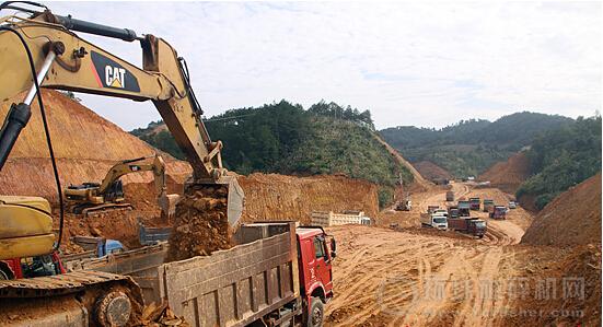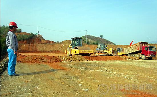 破碎機“咚咚咚”地破碎山石,挖土機忙著挖掘碎石和泥塊,壓路機來回運轉夯實路基,而運輸車則來來往往清運石料泥土,現(xiàn)場還有施工人員指揮各種機械進行施工作業(yè)。