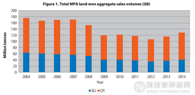 報告顯示,2014年英國砂和礫石以及機制碎石的銷量分別增加了6.1%和13.5%,這表明英國經(jīng)濟正在向好的方向發(fā)展。緩慢復蘇的經(jīng)濟將拉動對砂石骨料這一主要建筑原料的需求,可以預(yù)見的是,英國市場對砂石的需求會不斷上升。英國礦產(chǎn)協(xié)會的會員單位覆蓋了英國90%的砂石市場,下圖為其會員單位砂石銷售量統(tǒng)計。