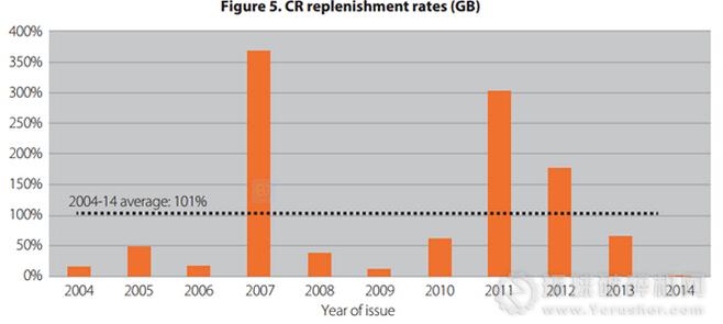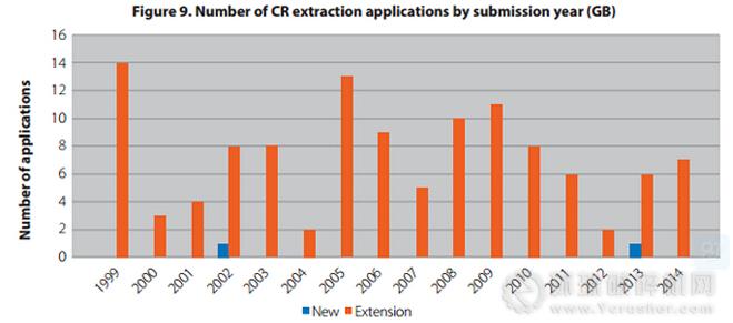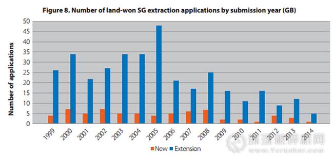 受2008年金融危機影響,英國砂石企業(yè)新礦申請數(shù)量大幅下降。砂和礫石開采申請一直呈現(xiàn)下降趨勢,而對機制碎石礦的申請則對市場需求反應(yīng)更加敏捷,近幾年機制碎石礦山延期申請數(shù)量總體略微上升,但仍不足以解決替代率偏低問題。