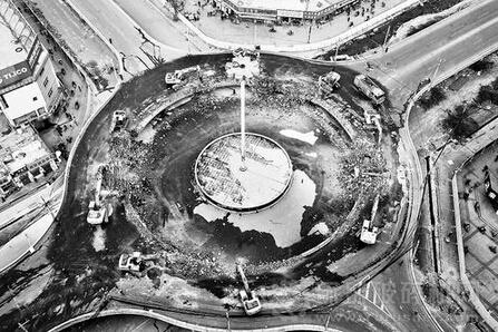 記者在現(xiàn)場(chǎng)看到,8輛大型破碎機(jī)圍著環(huán)島分塊作業(yè),在發(fā)動(dòng)機(jī)助力下,一個(gè)個(gè)鐵