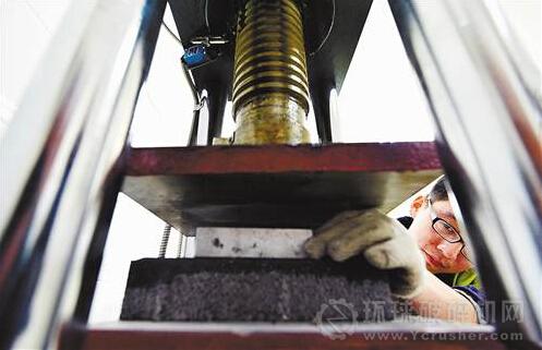 檢驗室的工作人員正在對用建筑棄料制作的透水磚進行抗壓測試。