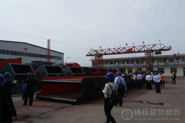嘉賓對(duì)眼前兩臺(tái)大型振動(dòng)篩分別是(6米、7米)長(zhǎng)進(jìn)行拍照,工作人員介紹了兩種振動(dòng)篩不同的特性以及技術(shù)區(qū)別。