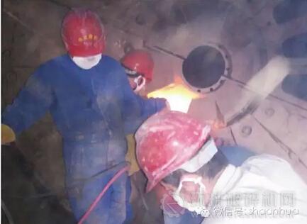 4#球磨機(jī)筒體中有16塊隔倉板、16塊護(hù)板,兩者每件分別重達(dá)200千克,M30×380 固定和焊接在一起,隔開磨機(jī)前后艙。要更換隔倉板和護(hù)板,前后艙兩側(cè)就近筒體壓條襯板必須拆裝。螺栓拆除時(shí)要用16磅大錘敲擊、再用氧氣焊割除。如此繁重的檢修量、有限的48小時(shí),氣焊在倉內(nèi)連續(xù)作業(yè),空氣潮熱,氣味散發(fā)慢,給檢修工作帶來很大困難。但是參加維保人員積極發(fā)揚(yáng)吃苦耐勞,能打硬仗,不怕困難,勇于拼搏的愛崗敬業(yè)精神,認(rèn)真按檢修程序和技術(shù)要求、不分晝夜連續(xù)奮戰(zhàn),48小時(shí)后,終于高標(biāo)準(zhǔn)、高質(zhì)量、安全完成了4#球磨機(jī)檢修任務(wù)。
