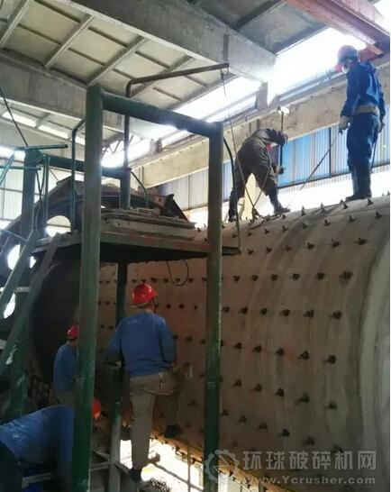 磨機(jī)4月份進(jìn)入計(jì)劃?rùn)z修期,要求更換隔倉板、護(hù)板。為了確保按時(shí)完成檢修任務(wù),維保分廠根據(jù)磷酸分廠檢修時(shí)間,將磷銨裝置區(qū)維保人員分成兩個(gè)檢修小組,白天晚上連續(xù)作業(yè),每組焊工、鉗工、技術(shù)員、班長(zhǎng)合理安排、全員參與4#球磨機(jī)檢修工作。