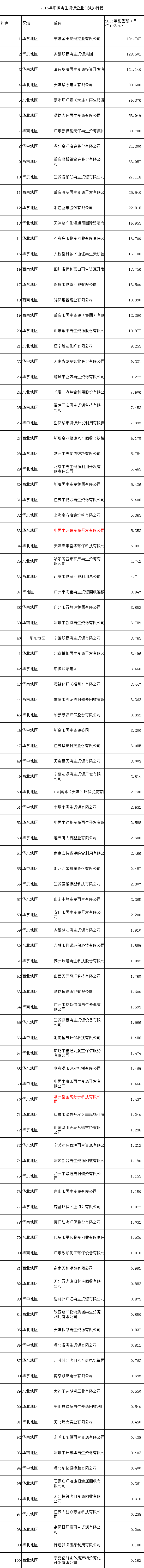 2015年中國(guó)再生資源百?gòu)?qiáng)企業(yè)排行重磅出爐