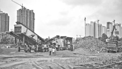 機(jī)械前,這臺(tái)龐然大物名為建筑垃圾移動(dòng)破碎站。建筑垃圾移動(dòng)破碎站其實(shí)是一輛大型特種設(shè)備車。建筑垃圾移動(dòng)破碎站不停地運(yùn)轉(zhuǎn)著,一頭送進(jìn)去磚石、瓦塊、樓板等建筑垃圾,另一頭出來的是顆粒或者石頭。