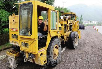 7月18日,來自美國的工程師丹尼·迪歐、邁克·盧德威克正在紹甘線“白改黑”改造工程南岸村施工路段操作一臺(tái)原裝進(jìn)口共振式混凝土破碎設(shè)備。