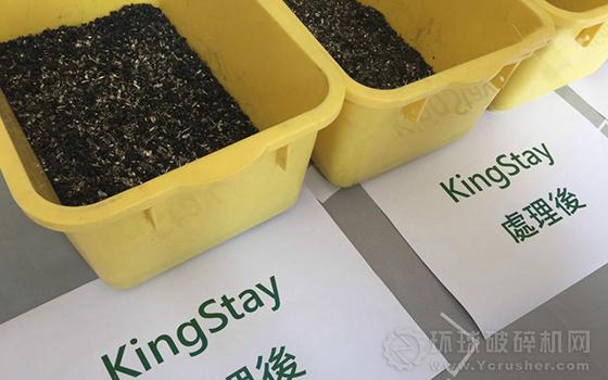 不同部件的分類完成,便會進入粉碎階段。在一臺 K3-大型高速破碎機前我們可以看到,在這一步,舊手機零件受到了毀滅性破壞:變成細碎小顆粒。