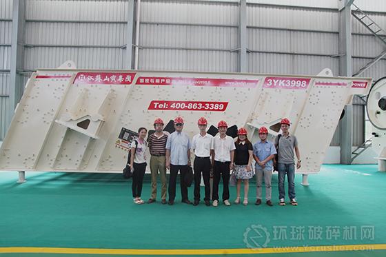 隨后,考察團(tuán)在王宇翔董事長的陪同下參觀了設(shè)備展示車間。胡會長仔細(xì)詢問了每臺設(shè)備的設(shè)計參數(shù)和市場優(yōu)勢,并提出了寶貴意見。3YK3998重型圓振動篩引起了考察團(tuán)的注意,據(jù)介紹,該振動篩有效篩分面積大,最大進(jìn)料粒度為200mm,處理能力為1000~1800t/h,是由山寶集團(tuán)自主研制的一款獲得國家專利產(chǎn)品的新型智能化圓振動篩,產(chǎn)品一經(jīng)面世投產(chǎn),就深獲客戶的好評。