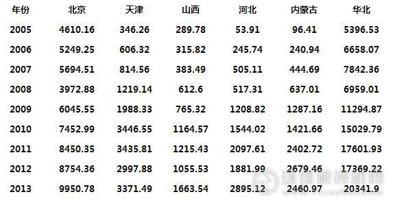 2005-2013年華北地區(qū)混凝土消耗砂石量(萬(wàn)噸)(僅供參考)