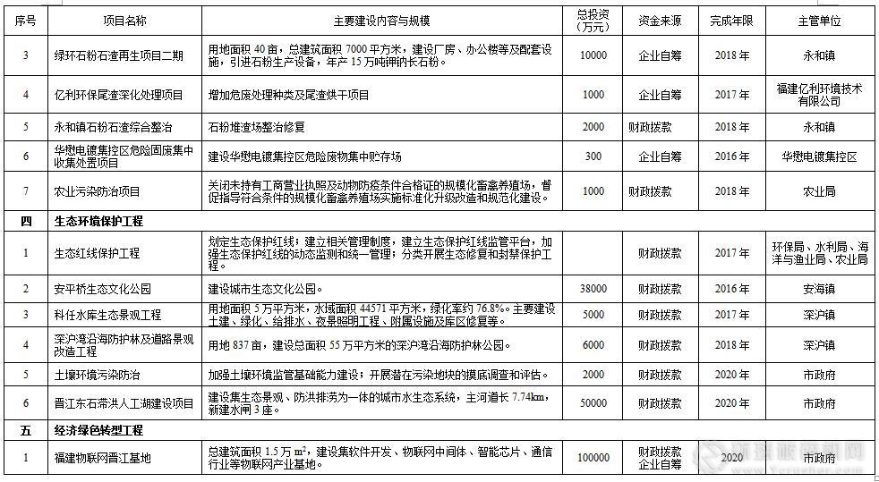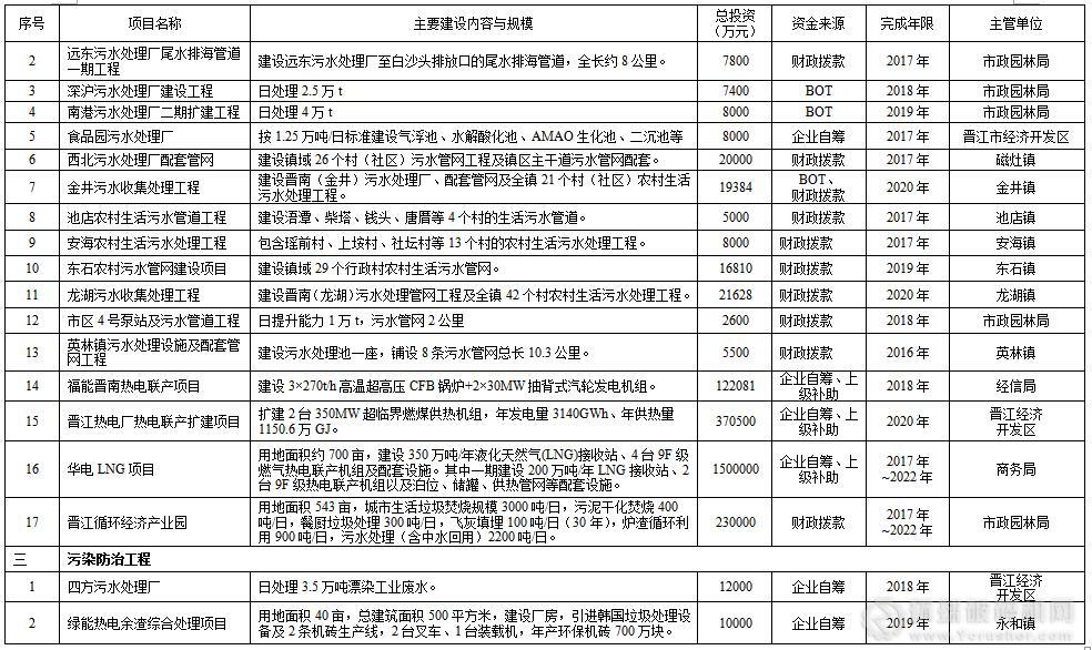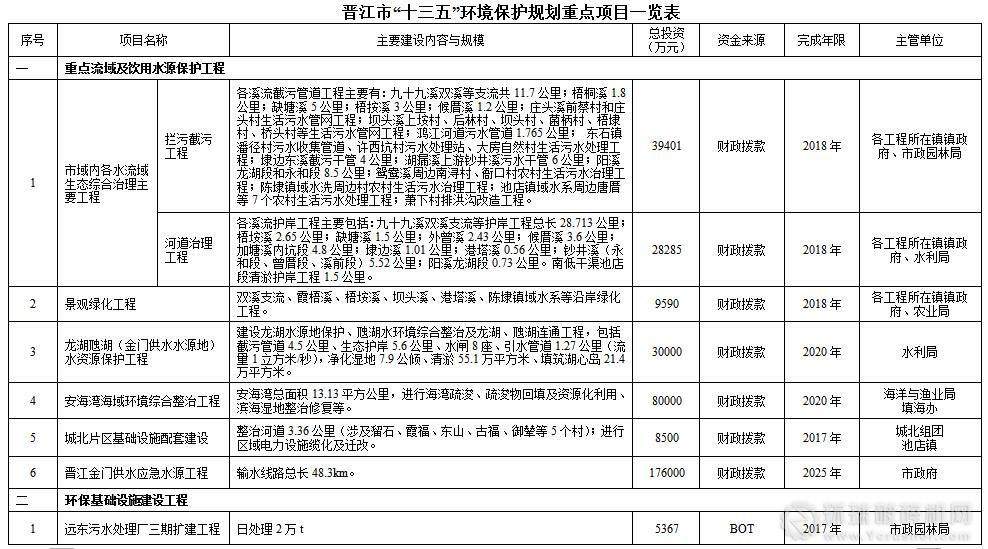 日前,《晉江市“十三五”環(huán)境保護規(guī)劃》已經(jīng)印發(fā)。“十三五”期間,福建晉江以政策推進和機制創(chuàng)新為突破口,著力解決當期遇到的環(huán)境問題,在政府主導、市場推進和公眾參與下,以重點項目實施,帶動環(huán)境污染治理的全面開展,確保本規(guī)劃的目標任務得以實現(xiàn)。“十三五”期間重點項目主要包括重點流域及飲用水源保護工程(6個項目)、環(huán)保基礎設施建設工程(20個項目)、污染防治工程(7個項目)、生態(tài)環(huán)境保護工程(7個項目)和經(jīng)濟綠色轉(zhuǎn)型工程(2個項目)等。涉及污水處理、土壤污染治理等環(huán)保項目。