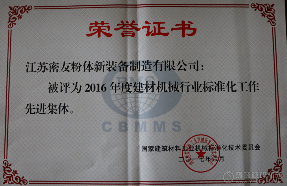 近期,密友粉體裝備制造榮獲2016年度建材機(jī)械行業(yè)標(biāo)準(zhǔn)化工作先進(jìn)集體榮譽(yù)證書。