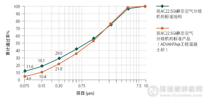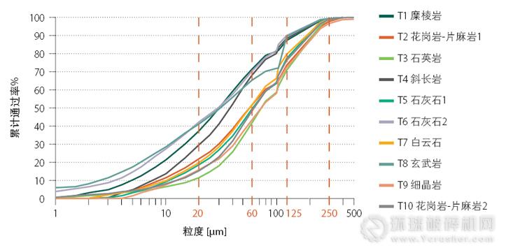 利用重力式慣性GI空氣分級機一次分級后,全部10種碎石砂中填料的固有級配。100靘處曲線的明顯“折曲”是所采用PSD測量方法的一種假象。