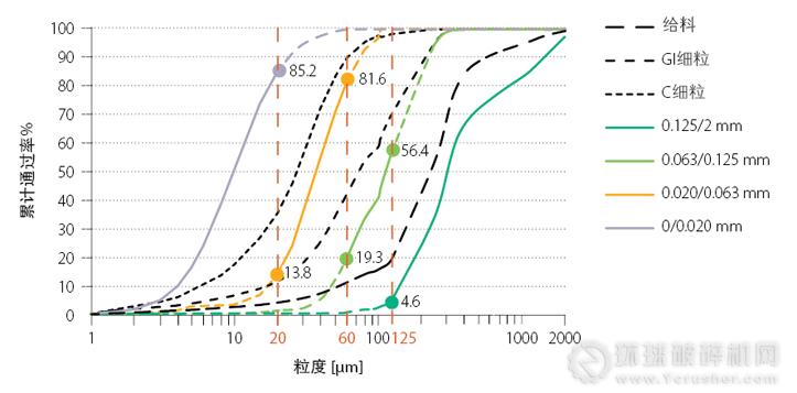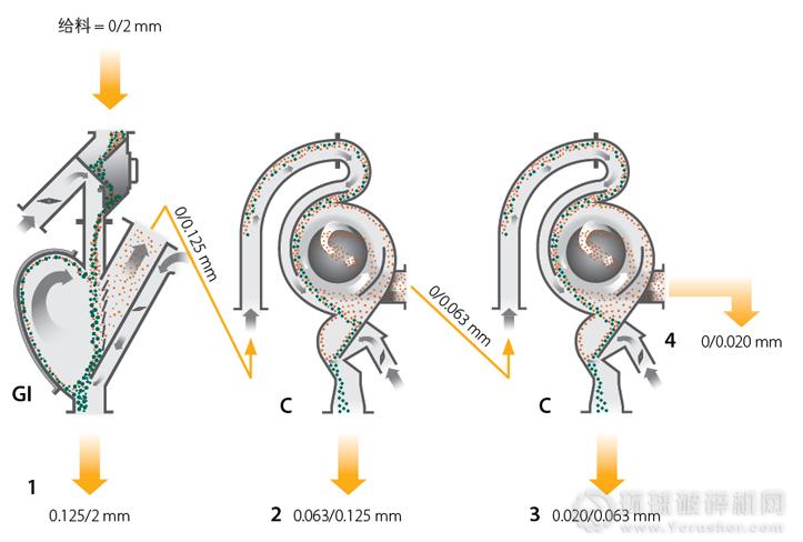 石英石物料完整空氣分級的示例(0/2mm給料分級為0.125/2、0.063/0.125、0.020/0.0630和0/0.020mm的粒級)。