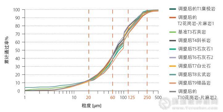 如果以石英石的初始級配作為基準(zhǔn)曲線,試著重組所獲得的粒級,便可實現(xiàn)具有相同精確度的大量更廣范圍的其他曲線。100靘處曲線的明顯“折曲”是所采用PSD測量方法的一種假象。