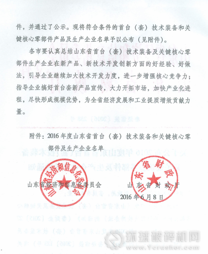 近期,山東省經(jīng)濟(jì)和信息化委員會公布了山東省內(nèi)獲得2016年度國內(nèi)首臺(套)技術(shù)裝備和關(guān)鍵核心零部件項(xiàng)目的企業(yè)名單,棗莊市金山機(jī)械股份有限公司名列其中,金山機(jī)械JSPCD型臺時(shí)3000噸智能控制礦物破碎機(jī)經(jīng)過嚴(yán)格的檢驗(yàn),通過了重重審核,最終獲得“2016年度國內(nèi)首臺(套)技術(shù)裝備及關(guān)鍵核心零部件”殊榮。