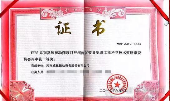 威猛股份研發(fā)生產(chǎn)的“WFPS系列復頻振動篩項目”于2017年8月9日經(jīng)河南省裝備制造工業(yè)科學技術(shù)獎評審委員會評審獲得一等獎。